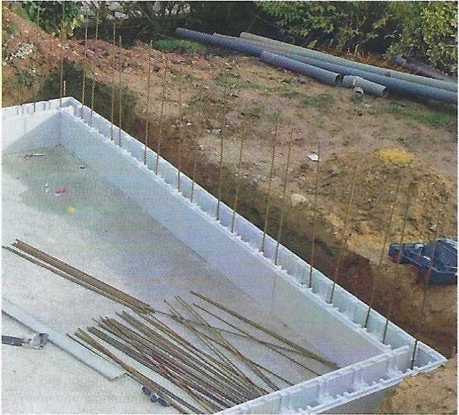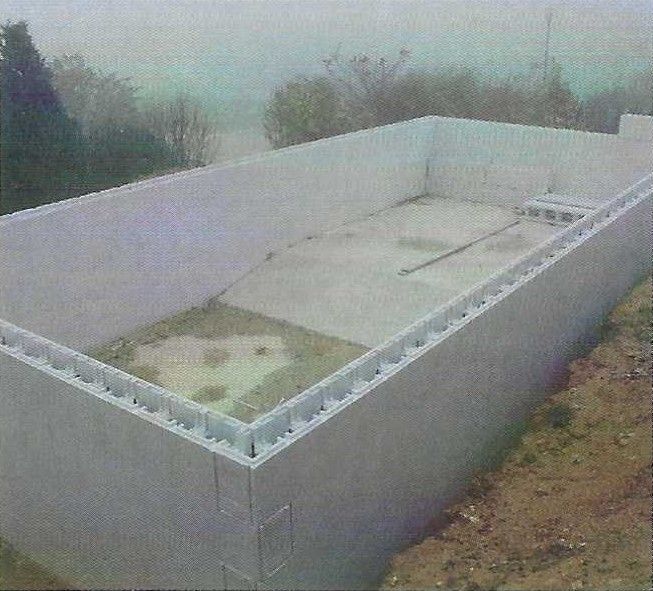 Equipé d'une Pompe à chaleur réversible chauffant toute l'année si vous le désirez et refroidissant l'eau en cas de canicule, la construction reprend la technique que nous employions en 1973 lors du premier choc pétrolier, à savoir un coffrage perdu en polystyrène dans lequel on coule du béton ferraillé.